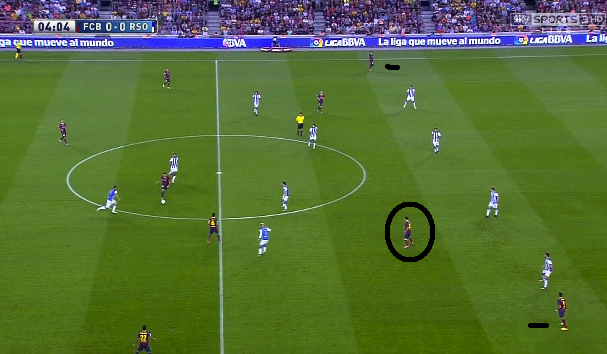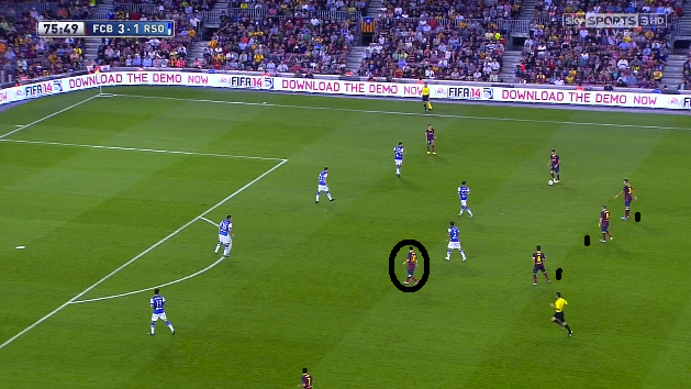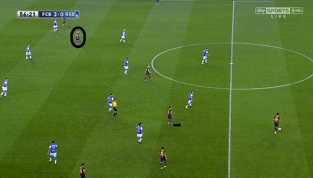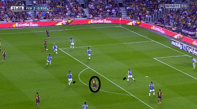 Otra muestra, en la jugada que da origen al tercer gol. Neymar y Adriano en banda, Iniesta algo detrás de ellos. Eso fija a cuatro jugadores de la Real. Alexis en la otra banda cogiendo el lateral. Messi va a buscar la pelota con sólo dos hombres que pueden acudir a su marca, pero con espacio suficiente para ser letal.