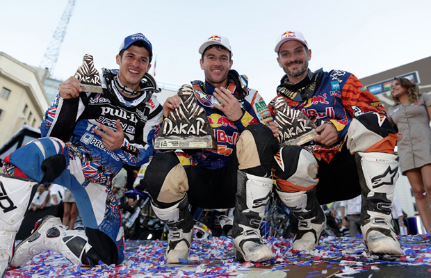 El también catalán, Marc Coma se ha hecho con su cuarta victoria en la categoría de las dos ruedas seguido por su fiel escudero Jordi Viladoms, que ya lo acompañó en sus éxitos de 2006 y 2009. Los dos pilotos de KTM se han impuesto al francés Olivier Pain de Yamaha después de aguantar las envestidas de su líder, el también francés, Cyril Despres. Destaca también el noveno puesto de Joan Barreda y el espectacular decimosexto de la general y primera mujer de Laia Sanz, ambos con una Honda.